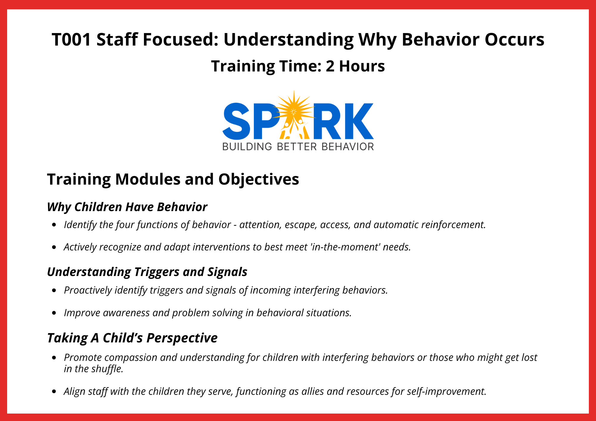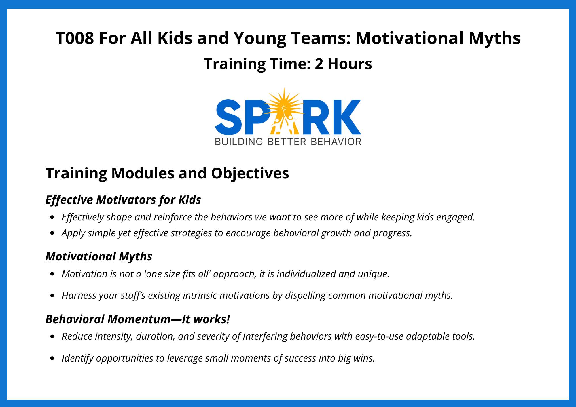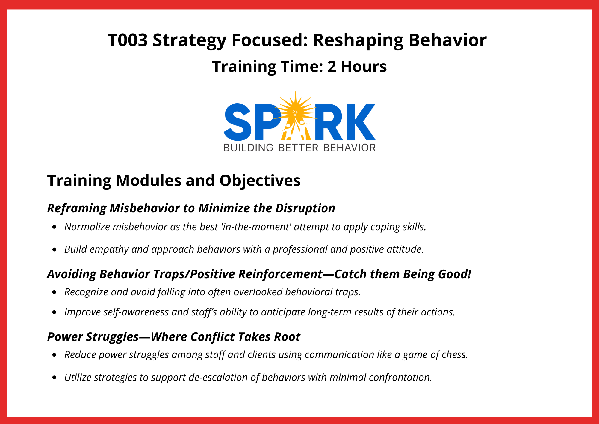 “The trainers at Spark truly care about all their clients. Their trainings provide you with the best strategies possible for handling youth with behavioral needs! I fully recommend working with Spark!”