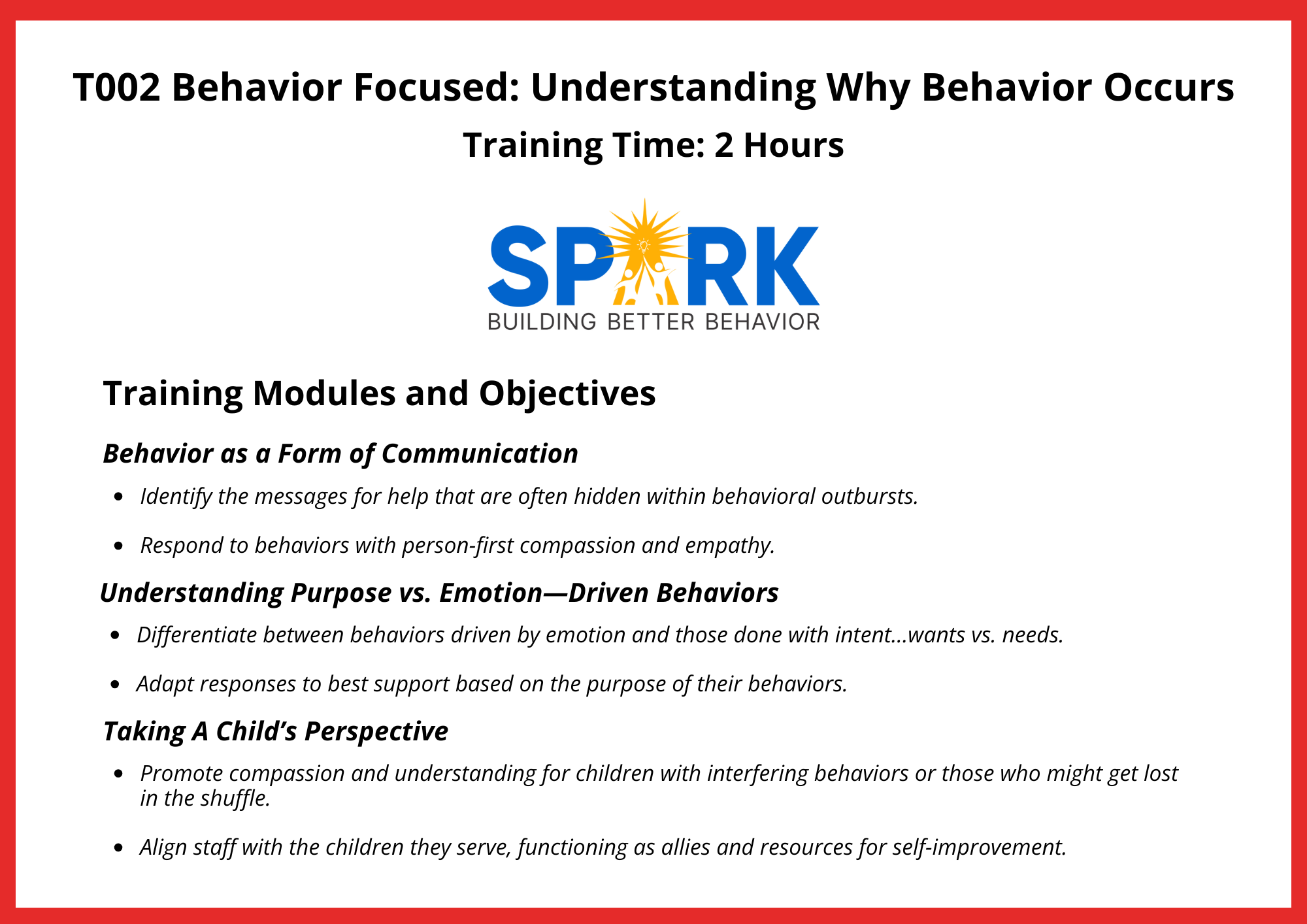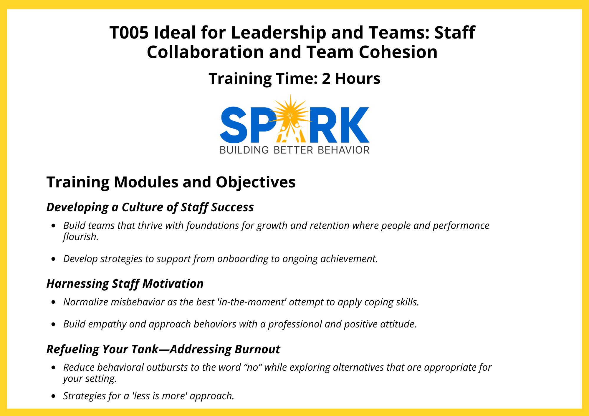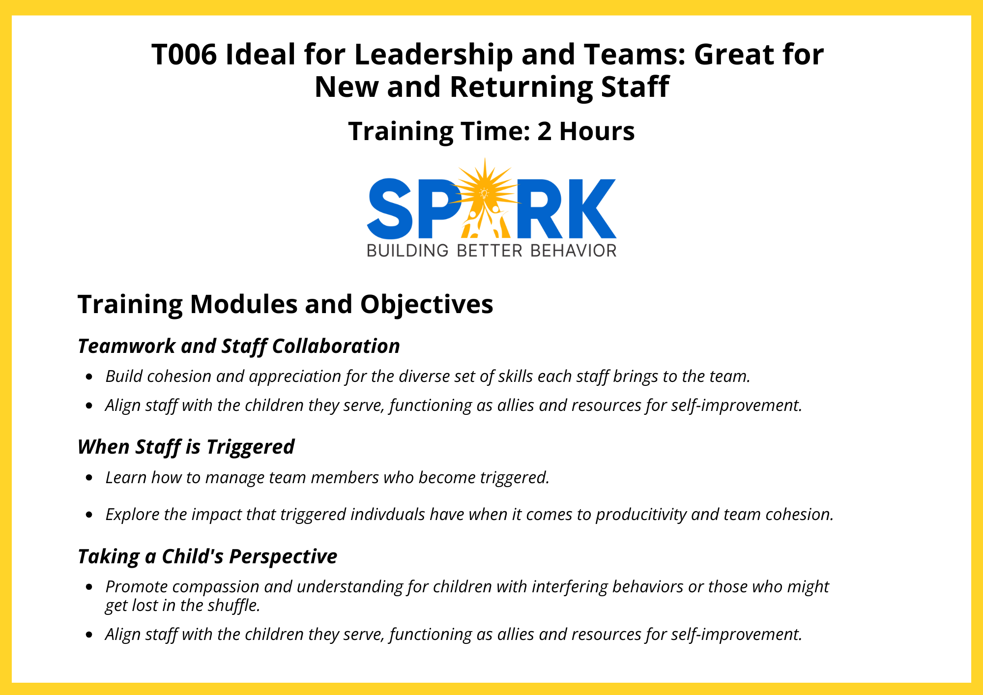 “The trainers at Spark truly care about all their clients. Their trainings provide you with the best strategies possible for handling youth with behavioral needs! I fully recommend working with Spark!”